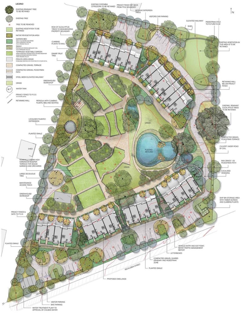 Connecting to the ironbark forest system of the region, the project is maintaining most of the native trees already on the site and incorporating a native landscape strategy where the intention is to enhance the biodiversity system by 50%. Native vegetation surrounds the homes and permeable paths conserve water. The landscape proposal emulates permaculture principles and understands the project site as part of a broader landscape.(source)
